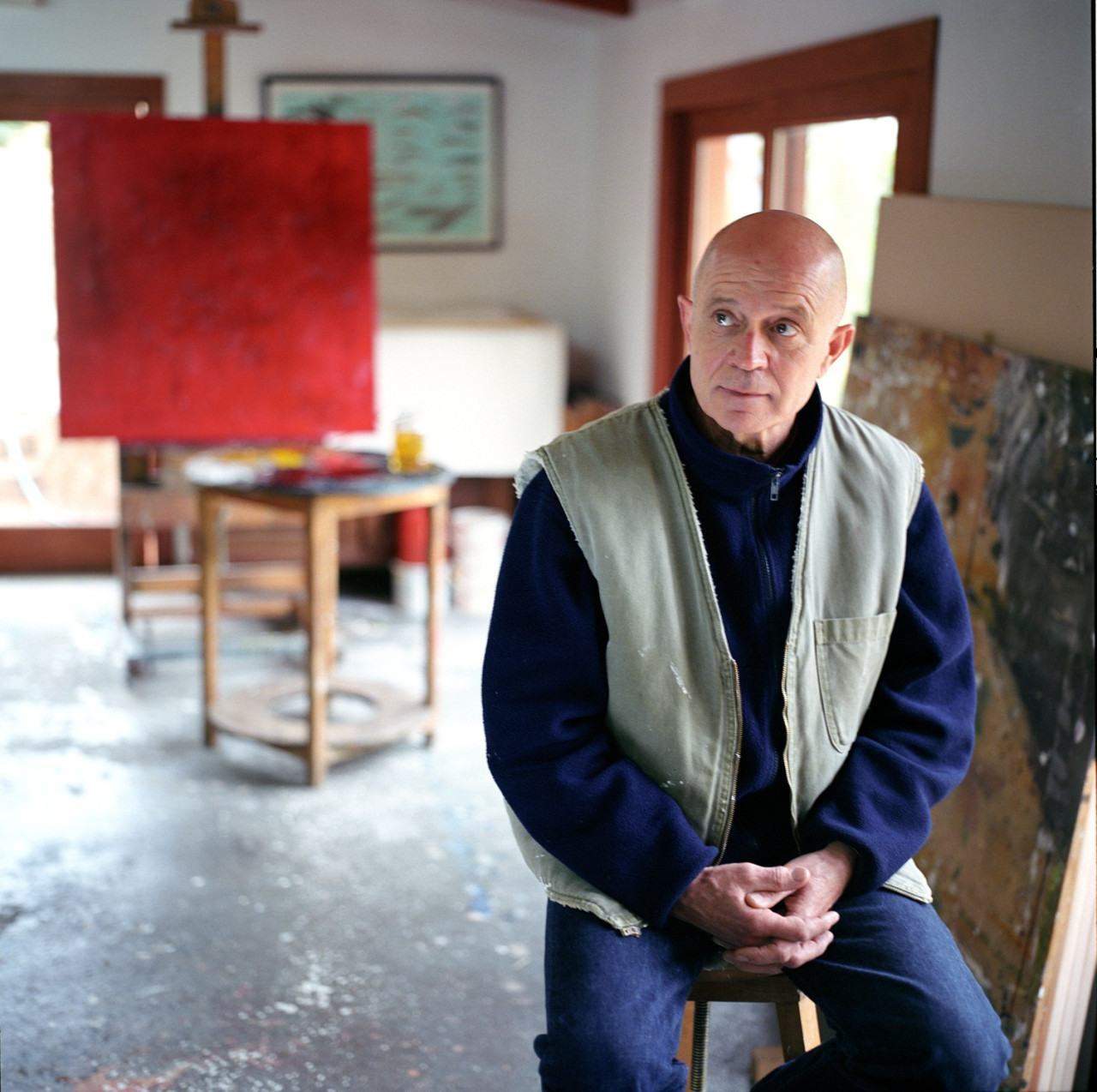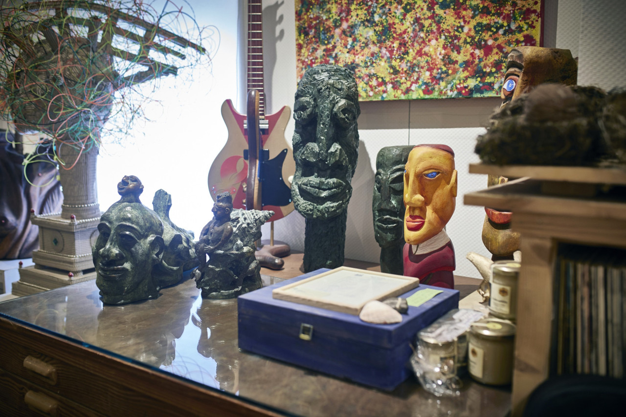 Seit 15 Jahren lebt und arbeitet er nun in einem alten Spaltschieferhaus in Langhecke. Sein Atelier gleicht einem Wimmelbild. Pinsel, Farben, Schnitzwerkzeuge. Bilder an den Wänden und zu Dutzenden hintereinander gereiht auf dem Boden. Schallplatten, Skulpturen, Bücher, Gitarren, ein Holzofen. Ein zehn Meter langer Holztisch dominiert den Raum, umgeben von unterschiedlichen Stühlen.