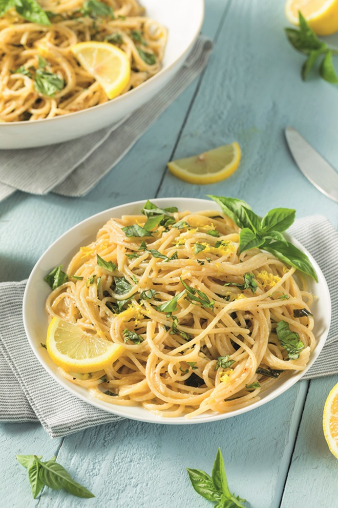 • ZITRONEN-PASTA MIT BASILIKUM: Leicht, frisch, aromatisch: Zitronensaft, Knoblauch, Olivenöl, Parmesan und frisches Basilikum – ein Sommergericht, das in 15 Minuten fertig ist.